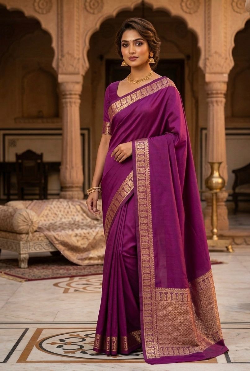 Elevate your ethnic wardrobe with this sophisticated Deep Magenta (Plum) saree, meticulously crafted from Premium Crepe material. This piece defines minimalist luxury with its buttery-soft texture and a sleek, small gold-toned border featuring intricate geometric patterns. It’s the perfect choice for those who love high-fashion elegance with effortless comfort.