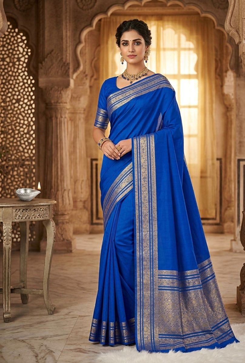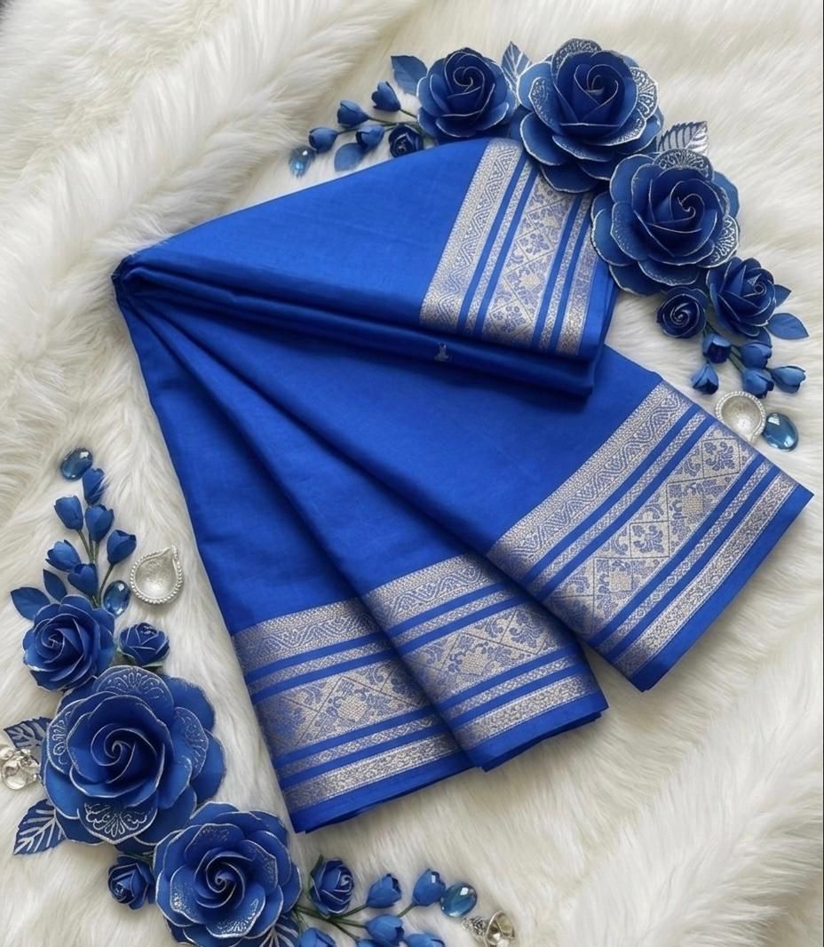 This vibrant Royal Blue (Electric Blue) saree is a showstopper. The rich, deep hue is perfectly complemented by a sleek, intricate silver-toned border, making it an ideal choice for evening parties, formal gatherings, or festive celebrations.