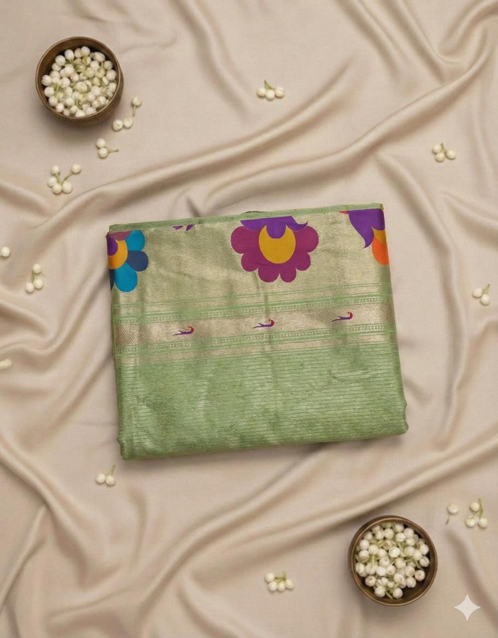 Grace meets tradition in this stunning Paithani Silk Saree with a rich pallu and grand big border 💚